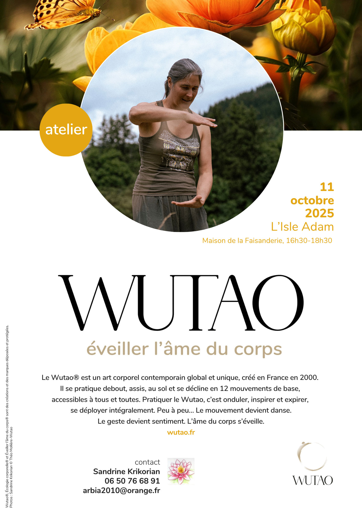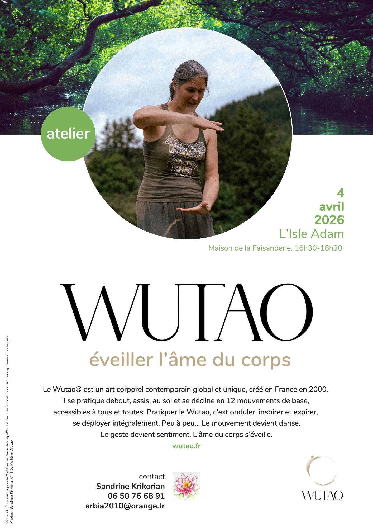 Le Wutao est un art corporel contemporain global et unique, créé en France en 2000. Il se pratique debout, assis, au sol et se décline en 12 mouvements de base, accessible à tous et toutes. Pratiquer le Wutao, c'est onduler, inspirer et expirer, se déployer intégralement. Peu à peu... Le mouvement devient danse. Le geste devient sentiment. L'âme du corps s'éveille.